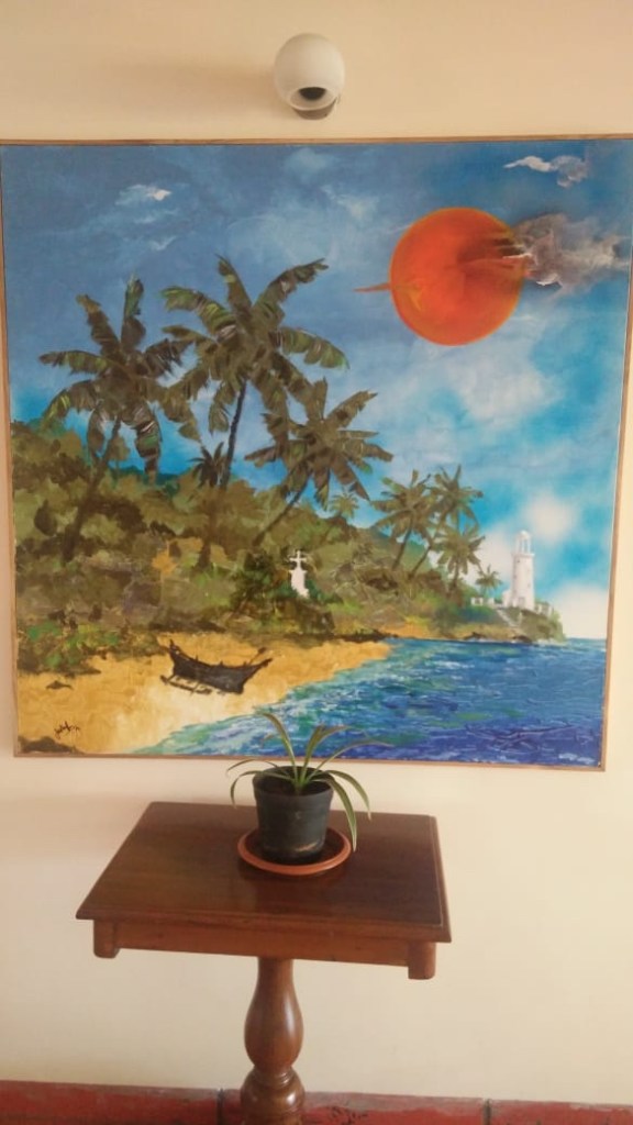 I asked him “ Have you had any exhibitions of your work?” Justino replied “ I  am not interested in doing so. I just enjoy my work . I certainly do not like to put a tag to my paintings. I’d rather give it away,  than lose my peace of mind.  The only time I had been given an award nationally was many years ago. My   painting was sent for some exhibition in Delhi. I was surprised that they   recognised my work for a prize.