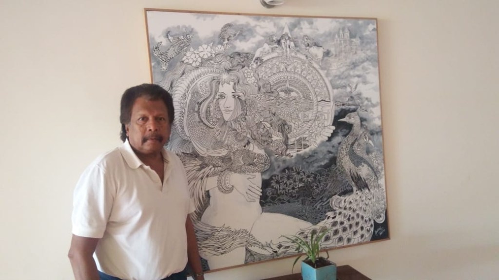I was privileged to meet with him and his wife Sonja , when Anjean and I were invited over to their home for dinner. Anjean is a school friend of Sonja That evening was eventful as I had a very interesting and intense conversation with Justino. He described his art and how he goes about it. I was amazed to know that he never planned his work on blank canvas.. He shared how he begins at one corner of the page and continued to draw or paint inspirationally throughout the page to cover it in entirety.