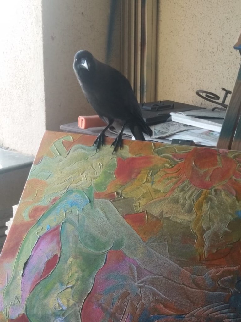 Soon  Crowie got so familiar that she even perched at the top of Justino’s easel. You can imagine  Justino’s delight to have sucḥ an admirer of his work .