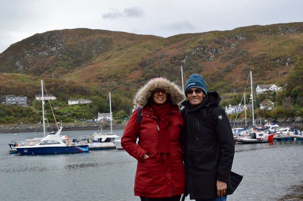 I got a nice picture beside the steam engine. The train steamed out of Fort William for a two hour ride to Malaig a tiny port famous for fishing . We had good weather ideal for photographs . We passed through forests and hills with mountains in the distance including the famous Ben Nevis. The train stopped for 20 minutes at Glenfinnan station. Passengers walked around. Since the engine was still emitting steam we took a few pictures with that at the backround.
