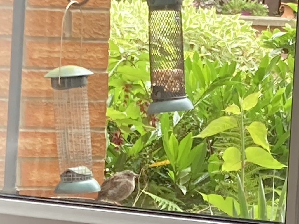 I see him always alone when he visits the feeder outside my door leading onto the garden . He was a baby and now seems to grow fast.